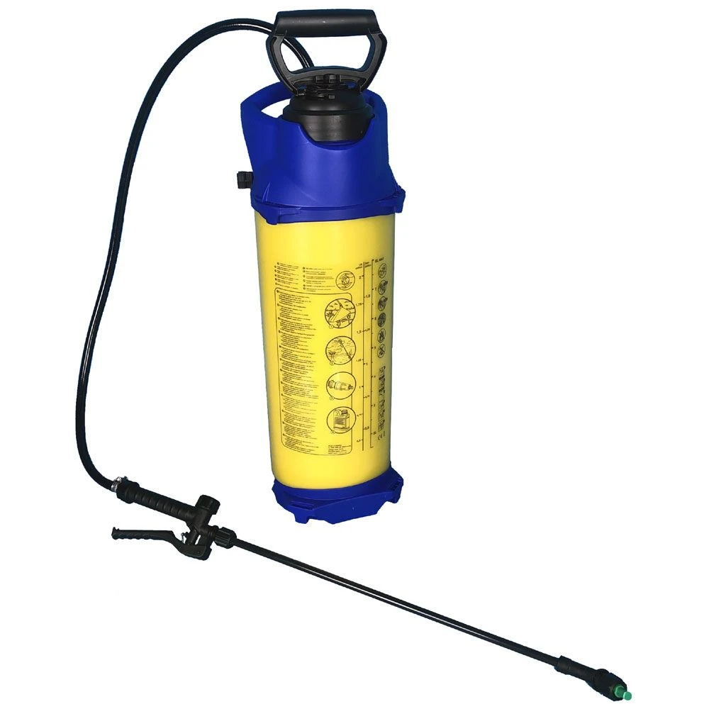 The pump assembly is removed to fill the tank. To spray, the pump is used to pressurise the tank. A safety valve prevents over-pressurisation. Spraying is controlled from the trigger valve.